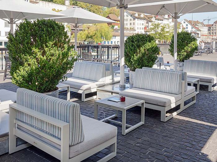 Auch im Bereich der professionellen Aussenmöblierung verschmelzen Innen- und Aussenbereich immer mehr. Passen Sie die Möbel im Aussenbereich Ihrem Unternehmen und Ihren Zielgruppen an. Übernehmen Sie, wenn möglich, auch den Stil der Innenmöbel. Dadurch verleihen Sie Ihrem Unternehmen ein einheitliches Erscheinungsbild.